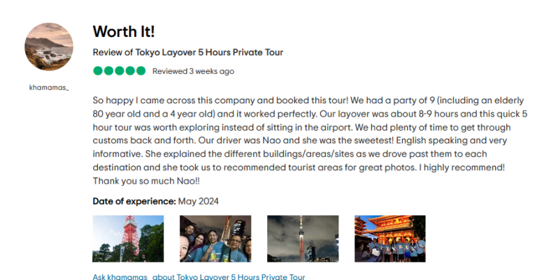 So happy I came across this company and booked this tour! We had a party of 9 (including an elderly 80 year old and a 4 year old) and it worked perfectly. Our layover was about 8-9 hours and this quick 5 hour tour was worth exploring instead of sitting in the airport. We had plenty of time to get through customs back and forth. Our driver was Nao and she was the sweetest! English speaking and very informative. She explained the different buildings/areas/sites as we drove past them to each destination and she took us to recommended tourist areas for great photos. I highly recommend! Thank you so much Nao!!